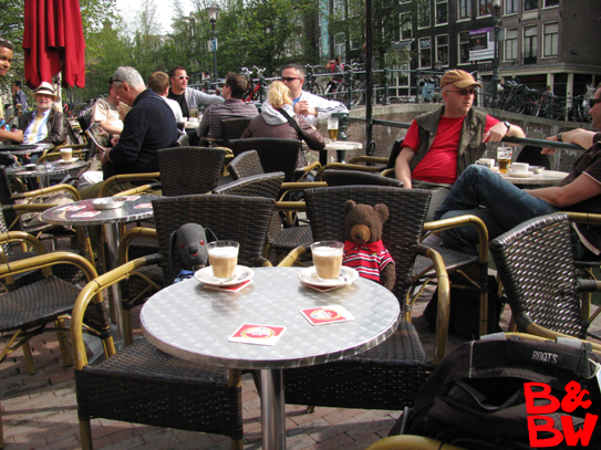 Canal-side cafes were everywhere in Amsterdam. Here the boys enjoy one last café au lait before heading to Schipol for the flight home.